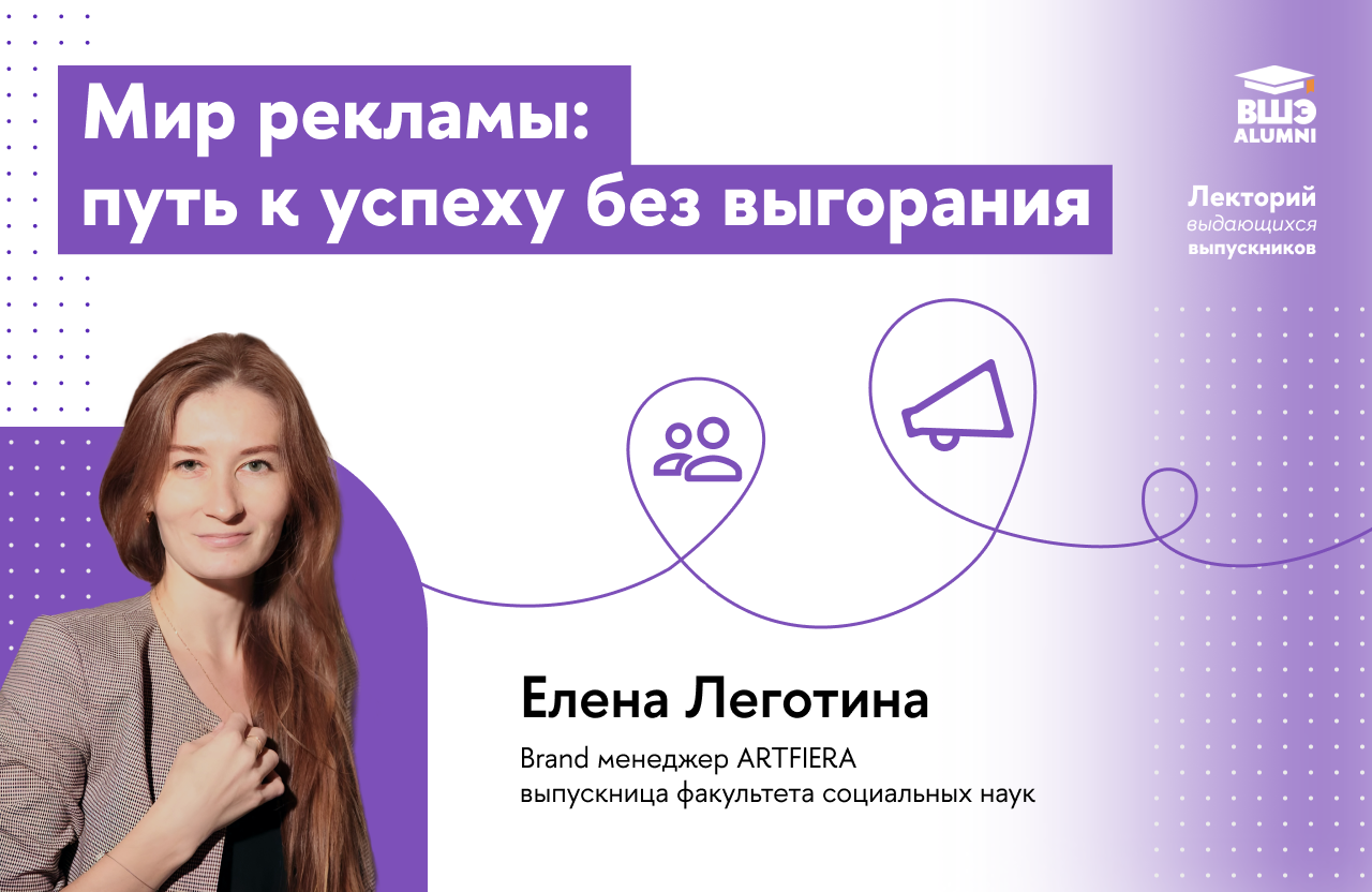 Наш следующий лекторий предлагает вам погрузиться в мир рекламной индустрии. Выпускница Вышки Елена Леготина поделится своим опытом и подходом к достижению профессиональных целей, сохраняя при этом личную энергию и мотивацию.